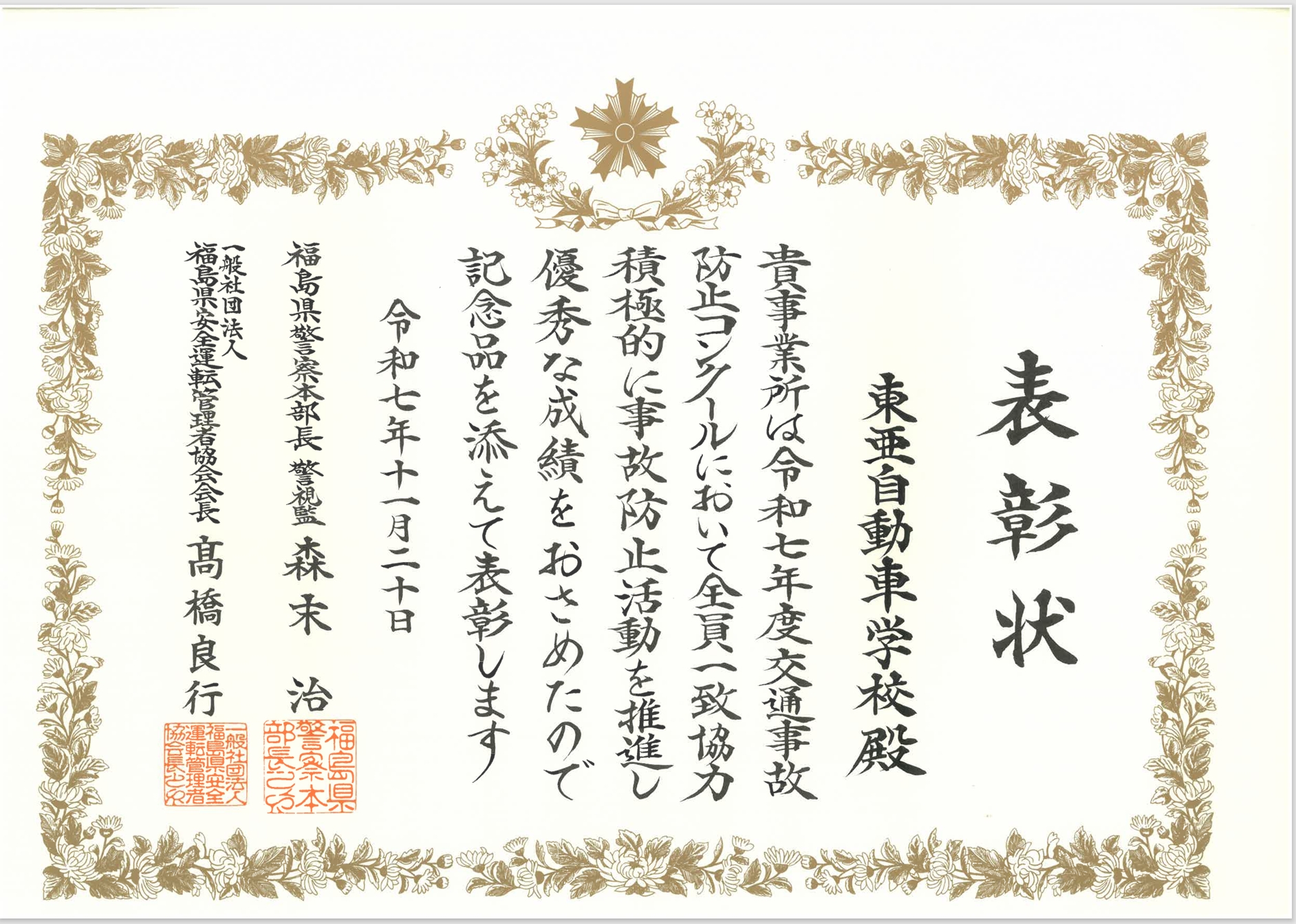 12月10日に交通事故防止コンクールの表彰状を東亜自動車学校が優秀事業所として、福島県警察本部長・福島県安全運転管理者協会長との連名表彰を受賞しました。
